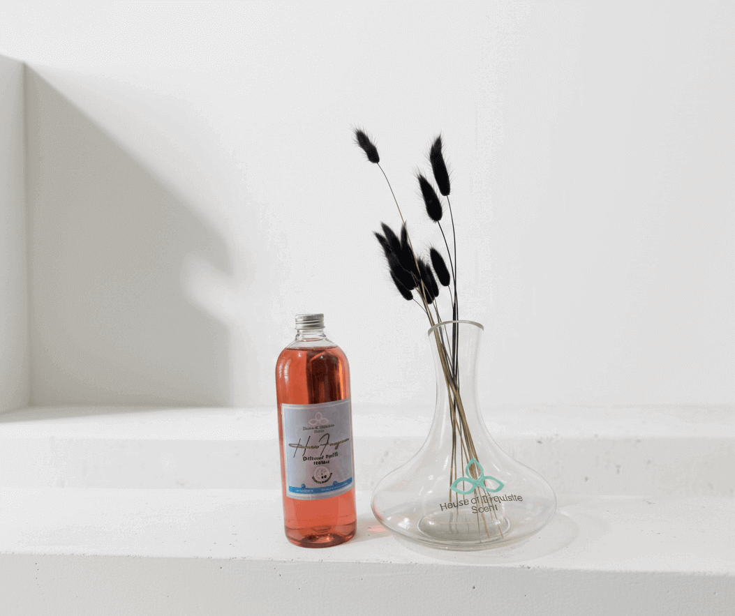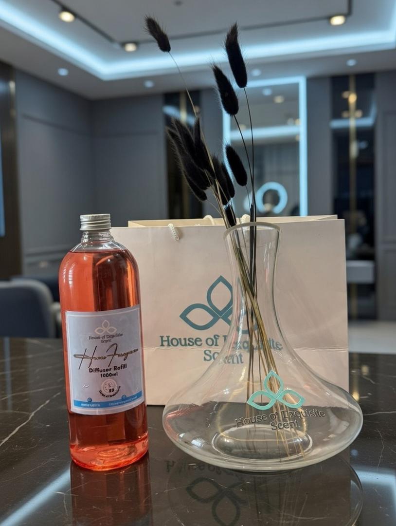 A sophisticated fragrance set featuring our elegant decanter diffuser with reeds and a matching refill, designed for continuous, long-lasting scent and timeless luxury in your space.