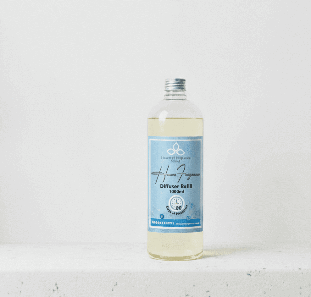 A premium diffuser set featuring a 1L transparent jar filled with fragrance, reeds, and an additional 1L refill. Ideal for large spaces, delivering long-lasting scent with a clean, elegant look.